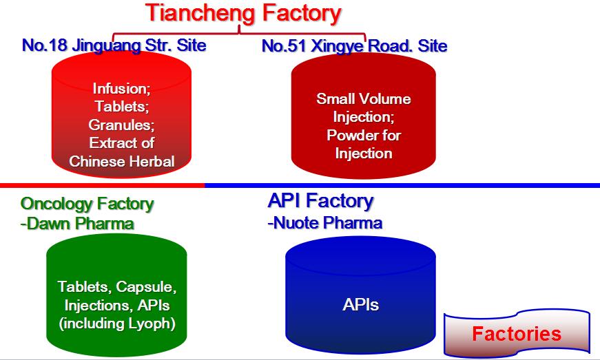 Now Hebei Tiancheng Pharma is a enterprises group containing Tiancheng Pharma (Generic drugs factory which has two sites at No.18 Jinguang Street and No.51 Xingye Road), Dawn Pharma (Oncology drugs factory), Nuote Pharma (API Factory), as well as Tianjin YTC Pharma (R&D Institute).