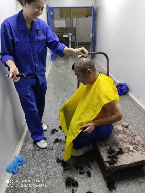 這一幕發生在11月21日公司中提車間。疫情阻擊戰開始至今已將近一月,為做好抗疫情保生產工作,公司采取了封閉式管理。500多名干部員工駐廠,堅守崗位,加班加點,維護了廠內良好的生產生活秩序。然而,封控近一個月,越來越多的人有了理發需求。尤其是男職工,一個個發壓眉、鬢過耳,凌亂而萎靡的樣子,讓人看在眼里急在心里。