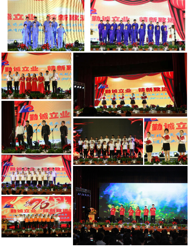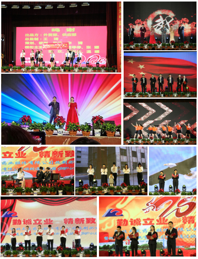 <節(jié)目名稱按圖片排列順序>1.外貿(mào)部、供應(yīng)部演繹《絕代風(fēng)華天成人》2.人力資源部和企管部合唱《天成人》3.渤海分公司合唱《真心英雄》4.輸液一車間舞蹈《美美噠》5.針劑一車間帶來的《走進新時代》6.固體車間小品《昨天,今天,明天》7.銷售業(yè)務(wù)部、銷售服務(wù)部帶來手語表演《感恩的心》8.道恩藥業(yè)詩朗誦《如今,我們已長大》9.銷售系統(tǒng)詩朗誦《改制20周年賀詞》10.生產(chǎn)、質(zhì)量系統(tǒng)詩朗誦《騰飛天成》