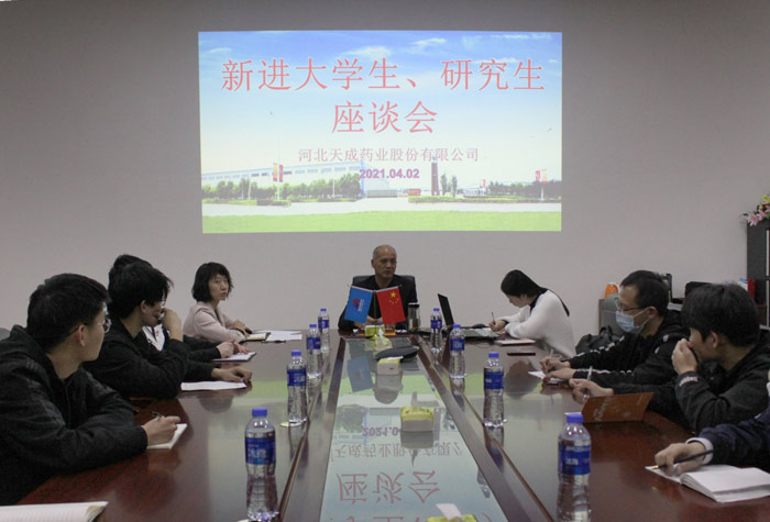 座談會在輕松、愉悅的氛圍中進行,來自不同地方、不同學府的40位青年大學生結合自身學習經歷進行了簡單的自我介紹。“擊水三千已揚帆,鵬程萬里正當時”,在聽取新進大學生的發言后,顥總首先對大家加入天成藥業表示熱烈歡迎,并向大家講述天成藥業五十年的發展歷程及企業的發展戰略,讓大家對企業有了更為深入的了解。顥總強調,藥品關系到人類生命健康,他要求大家要有愛心、有責任心,要認真學習《藥品管理法》,這體現出一個合格制藥人的責任。