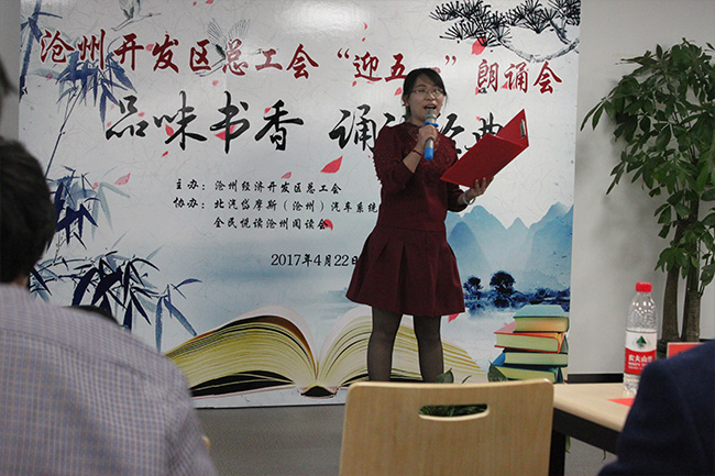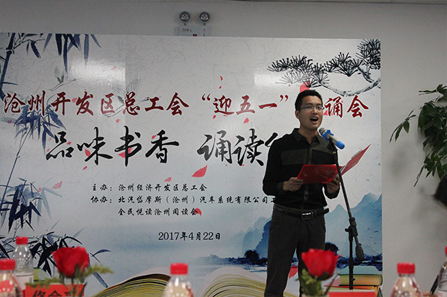 2017年4月22日,滄州開發區總工會主辦,北汽岱摩斯(滄州)汽車系統有限公司工會、全民悅讀滄州閱讀會協辦的“迎五一誦讀會”如期舉行。此次朗讀會主題為“品味書香,誦讀經典”,是為打造滄州東部新城,在開發區推廣全民閱讀的一次嘗試。我公司職工劉艷麗、鄭福貴分別在會上深情朗讀了詩歌《相信未來》、《希望,展翅飛翔》。