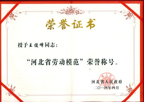 2014年4月榮獲“河北省勞動模范”榮譽稱號