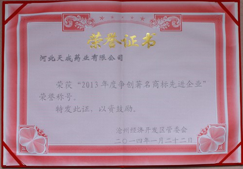 2014年榮獲“2013年度爭創(chuàng)著名商標(biāo)先進企業(yè)”榮譽稱號